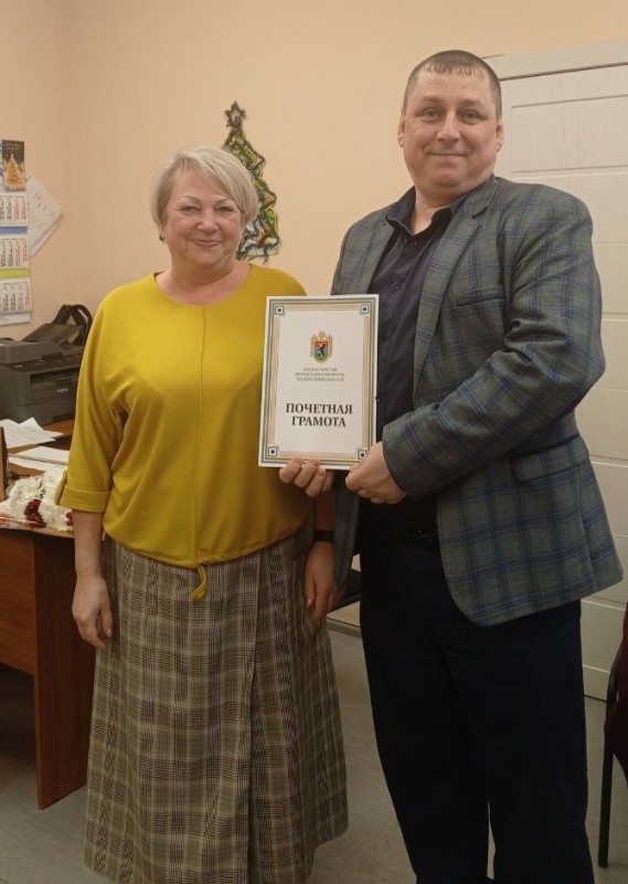Н.А.Аникиева, начальник отдела образования администрации Беломорского муниципального округа, вручила Ломашу В.А., директору МОУ «Сумпосадская СОШ», Почетную грамоту Министерства образования и спорта Республики Карелия.