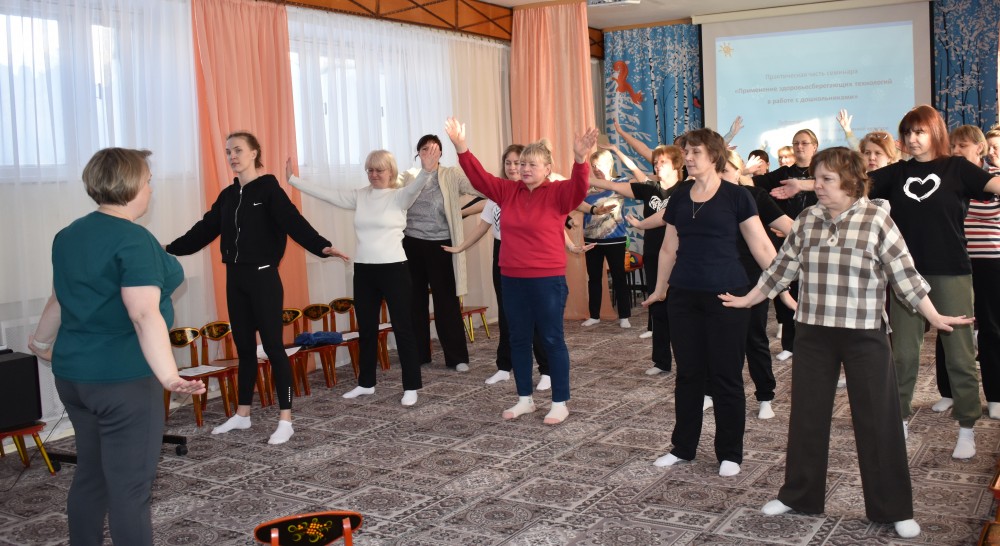 В практической части семинара приняли участие инструкторы по физическому воспитанию Геккина И.Н., Бахта Н.А. и Пьянкова В.В. Специалисты познакомили участников семинара с элементами стретчинга, рассказали, как применять упражнения на профилактику плоскостопия, показали комплекс виброгимнастики для детей и поиграли с физкультурным оборудованием «парашют».